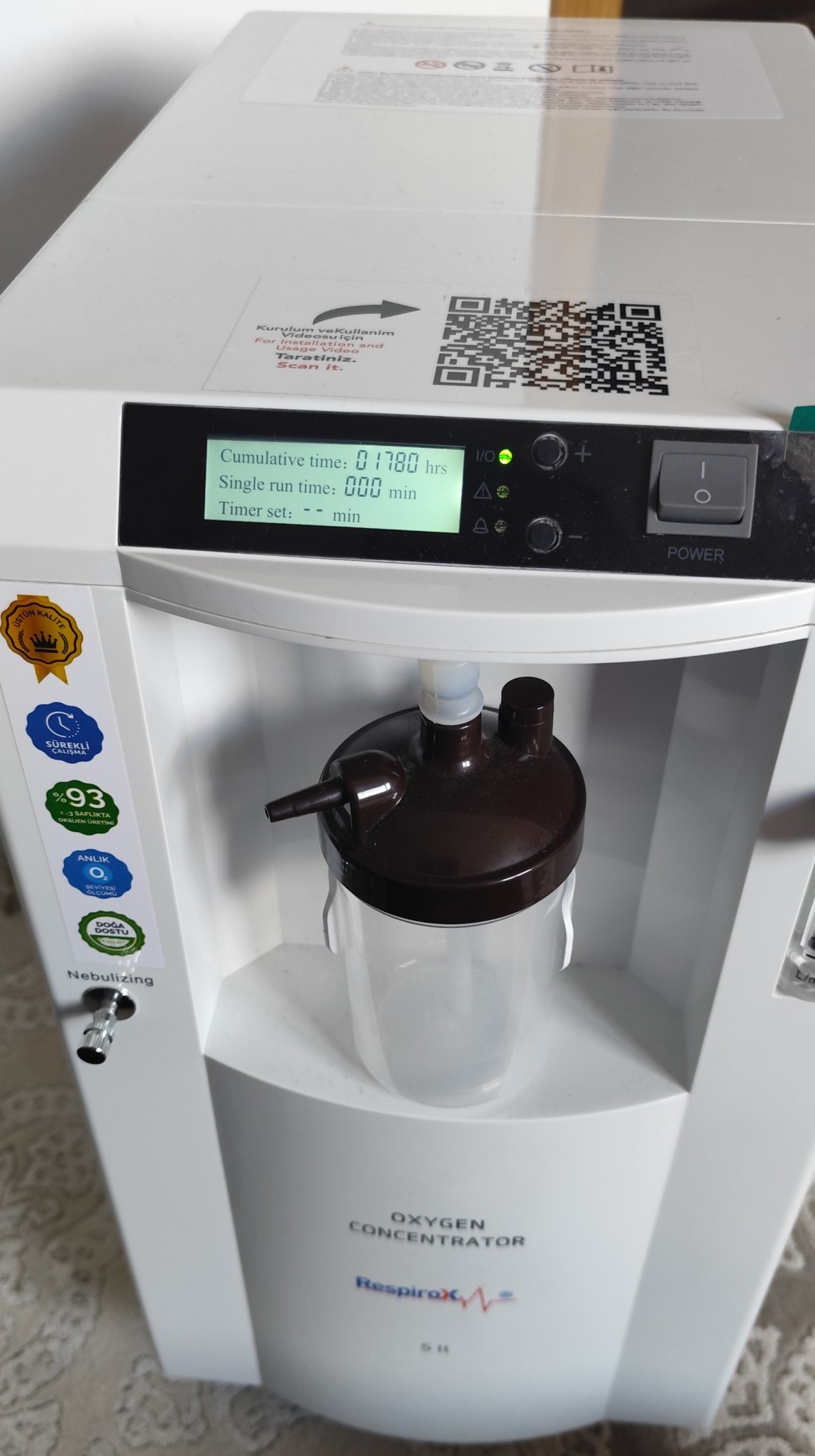 Görsellerde yer alan cihaz, bir Respirox JLO-590i model oksijen konsantratörüdür. Ürün, ev veya klinik ortamında solunum desteğine ihtiyaç duyan kullanıcılar için tasarlanmış bir medikal cihazdır. Cihazın temel işlevi, ortam havasından oksijeni ayrıştırarak yoğunlaştırılmış oksijen sağlamaktır. Ayrıca, ön paneldeki “Nebulizing” etiketi ve ilgili çıkış portu, cihazın solunum yolu ilaçlarının uygulanması için nebulizatör özelliğine de sahip olduğunu göstermektedir. Görsellerdeki kullanıcı el kitabının ve etiketlerin Türkçe olması, ürünün Türkiye pazarı için hazırlandığını düşündürmektedir. Cihazla birlikte gelen kullanım kılavuzu ve yeni, paketli aksesuarları, ürünün komple bir set halinde olduğunu göstermektedir.
