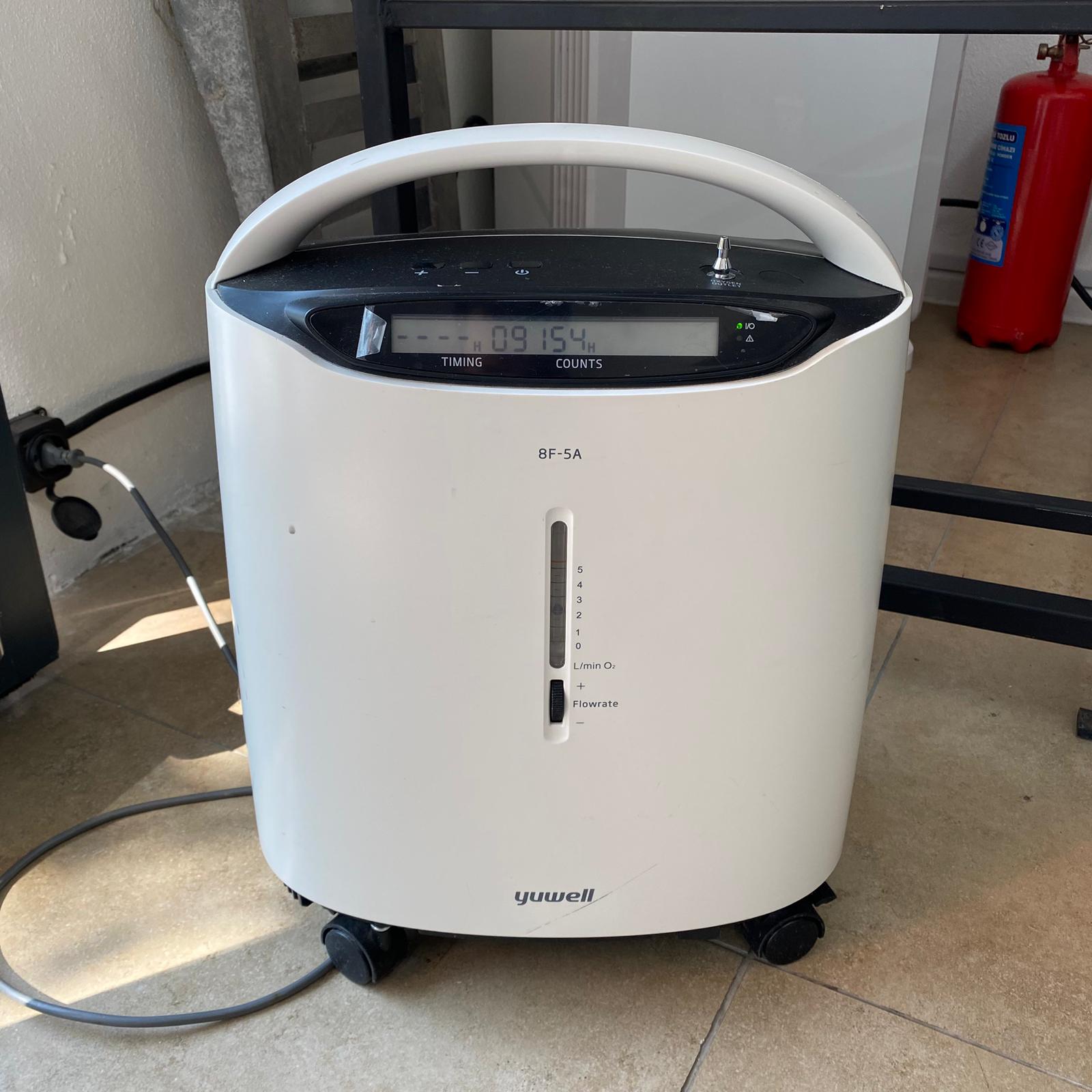 Görsellerde, tekerlekli ve taşınabilir bir yapıya sahip olan bir adet oksijen konsantratörü cihazı bulunmaktadır. Cihazın markası Yuwell, modeli ise 8F-5A olarak net bir şekilde okunmaktadır. Bu cihaz, ortam havasından oksijeni ayrıştırarak, kullanıcıya yüksek konsantrasyonda oksijen sağlamak amacıyla kullanılan bir medikal üründür. İncelenen görsellere dayanarak ürünün orijinal olduğu değerlendirilmektedir.