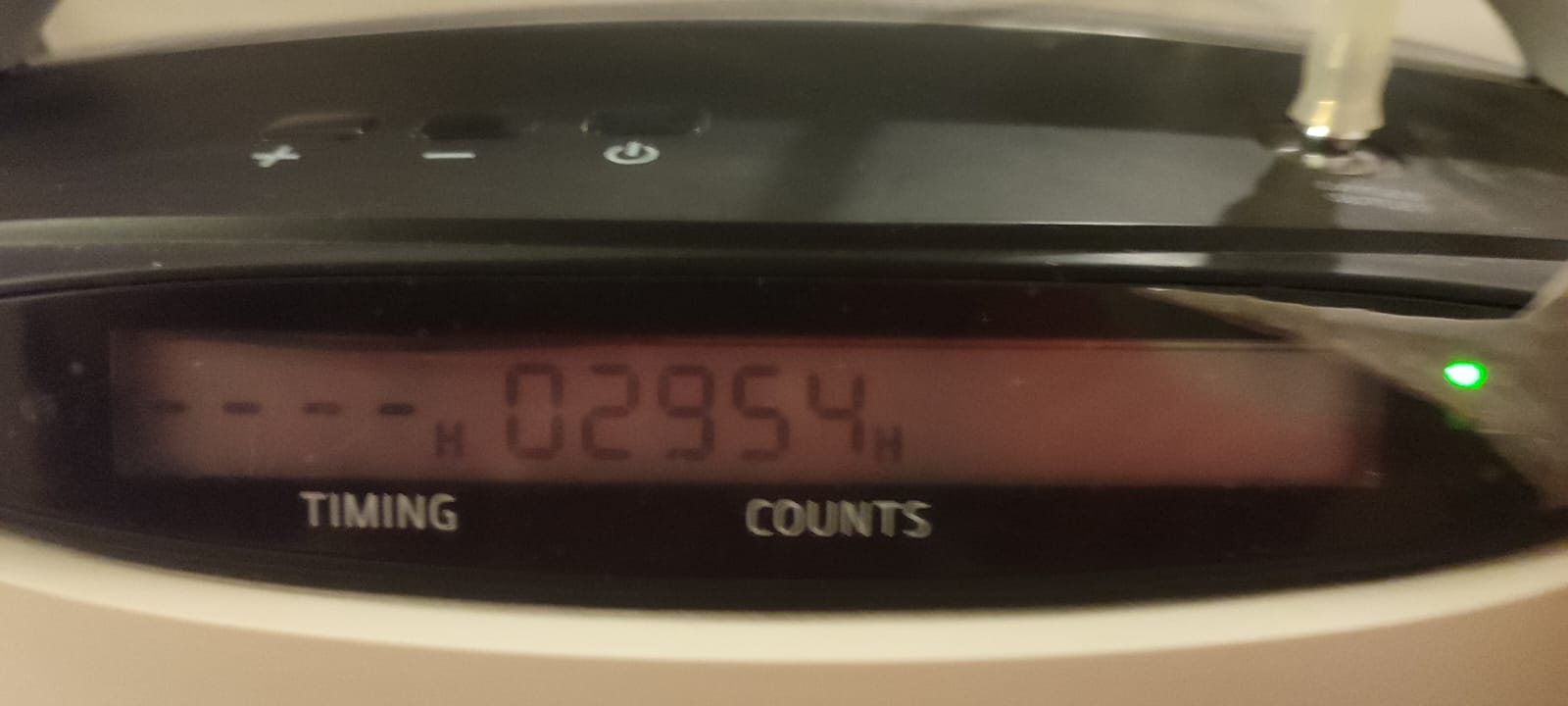 LCD ekran üzerinde “TIMING” ve “COUNTS” ibareleri arasında yer alan dijital sayaç, cihazın toplam çalışma süresini göstermektedir. Ekranda okunan değer 02954 H şeklindedir. Bu, cihazın bugüne kadar toplam 2954 saat kullanıldığını göstermektedir. Bu değer, cihazın azımsanmayacak bir süre kullanıldığını ancak ömrünü tamamlamadığını ifade eder.