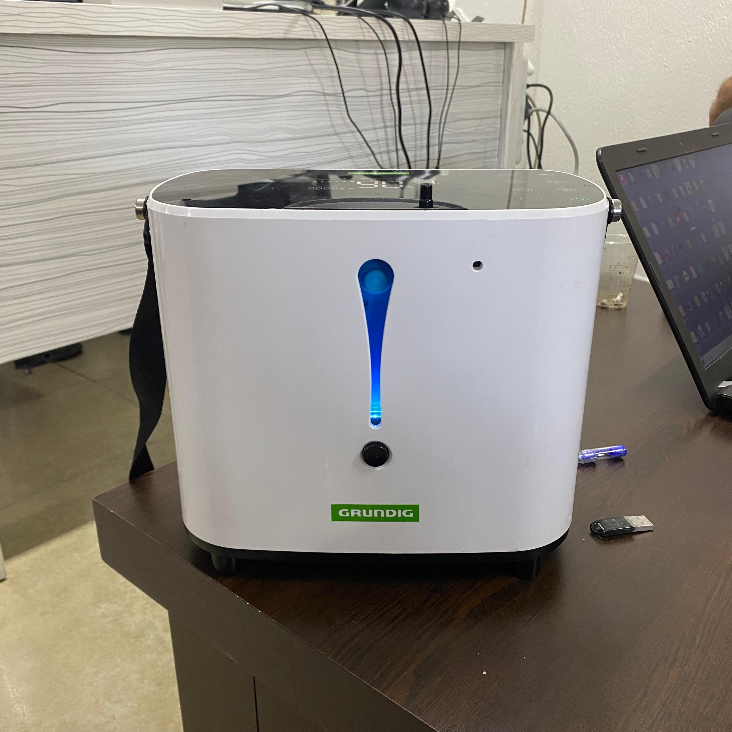 Görsellerde, ev ve araç kullanımına uygun, taşınabilir tipte bir Grundig marka oksijen konsantratörü bulunmaktadır. Cihaz, ortam havasındaki nitrojeni ayrıştırarak kullanıcıya yüksek konsantrasyonda oksijen sağlamak üzere tasarlanmıştır. Ürünün yanında güç kablosu ve su nemlendirme haznesi gibi aksesuarları da yer almaktadır.