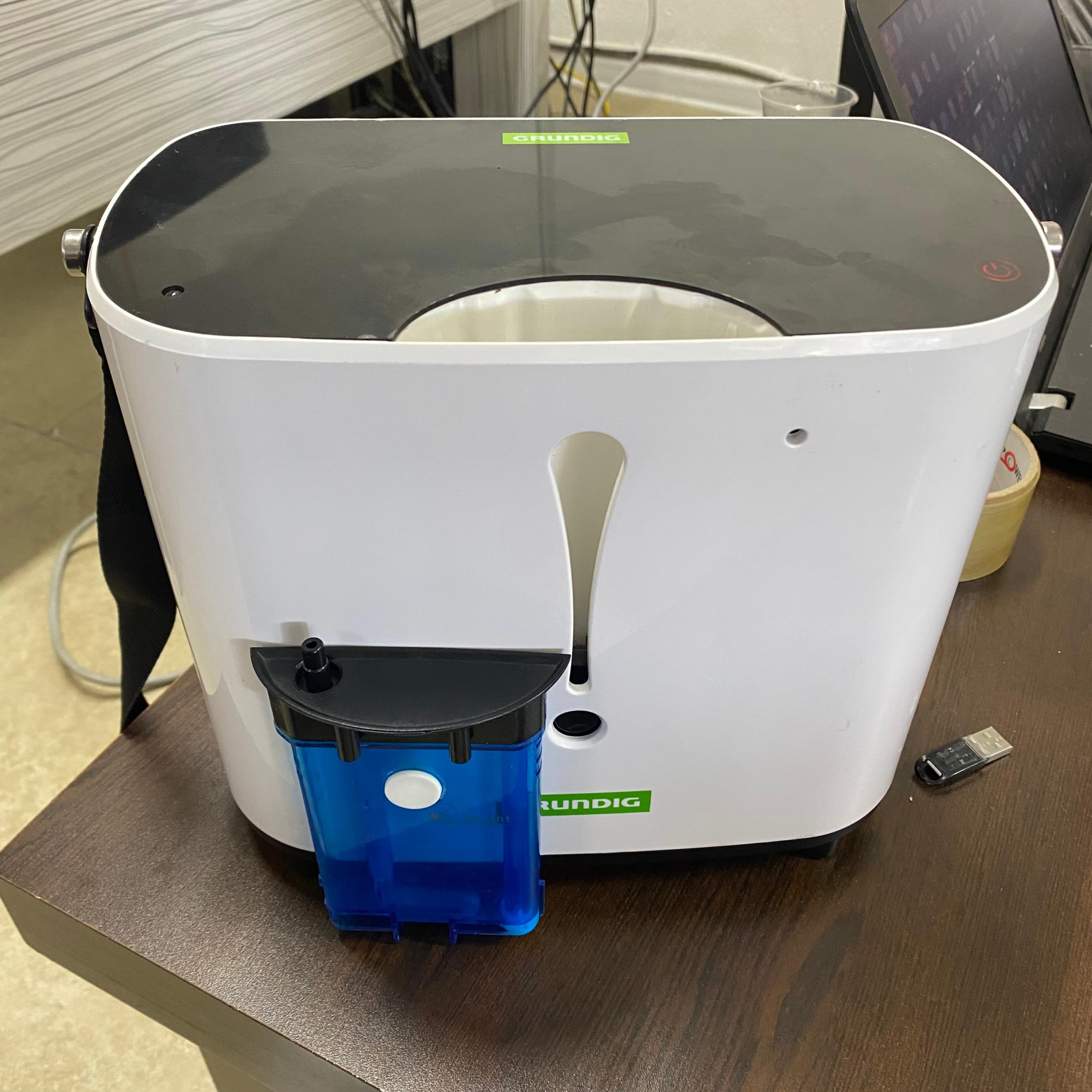 Yapılan detaylı görsel inceleme ve doğrulama sonucunda cihazın markasının Grundig olduğu net bir şekilde tespit edilmiştir. Marka logosu, cihazın ön yüzeyinde, üst kontrol panelinde ve mavi renkli su haznesinin üzerinde belirgin olarak görülmektedir. İnternet üzerinden yapılan hızlı araştırma, bu tasarımdaki cihazın BE04 veya BE04A model adıyla ilişkilendirildiğini göstermektedir. Ancak görsellerde model numarasına dair doğrudan bir yazı bulunmadığından, rapor sadece marka bilgisi ile sınırlandırılmıştır.