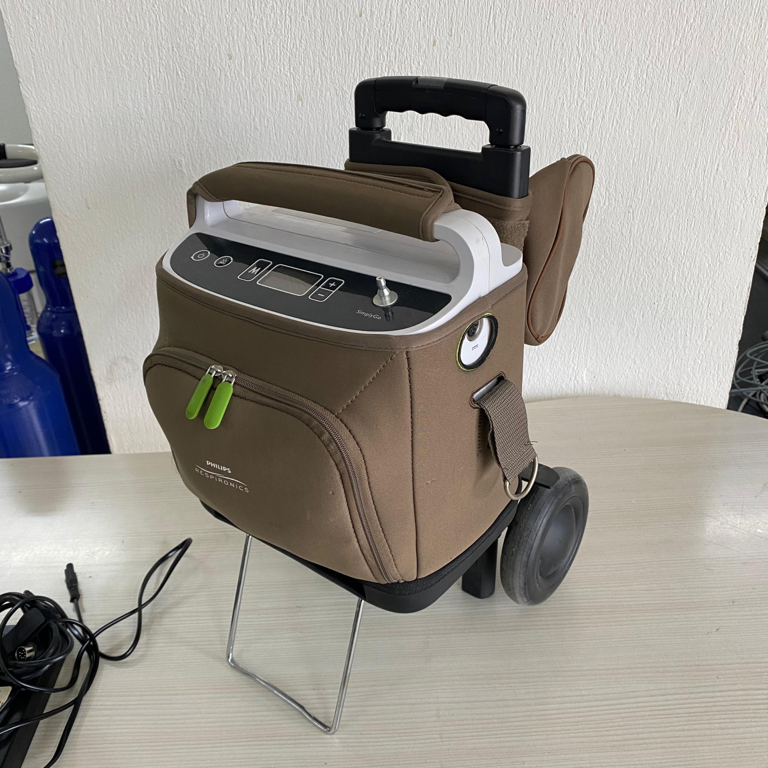 Yapılan detaylı görsel inceleme sonucunda, görüntülenen ürünün bir taşınabilir oksijen konsantratörü olduğu tespit edilmiştir. Cihazın ön paneli ve koruyucu taşıma çantası üzerindeki logolar ve yazılar incelendiğinde, markanın PHILIPS RESPIRONICS, modelin ise SimplyGo olduğu net bir şekilde okunabilmektedir. Ürün; ana cihaz, özel taşıma çantası, tekerlekli taşıma arabası ve güç adaptöründen oluşan bir set halindedir.
