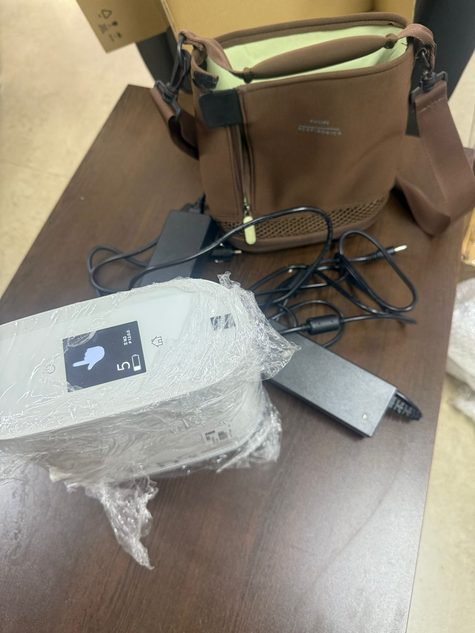 Görsellerde, Philips Respironics markasına ait, SimplyGo Mini model bir taşınabilir oksijen konsantratörü ve aksesuarları bulunmaktadır. Bu cihaz, kullanıcılara mobil haldeyken oksijen terapisi sağlamak amacıyla tasarlanmış kompakt bir medikal üründür. Görsellerdeki set, bir adet ana cihaz, bir adet taşıma çantası ve iki adet güç adaptöründen oluşmaktadır.