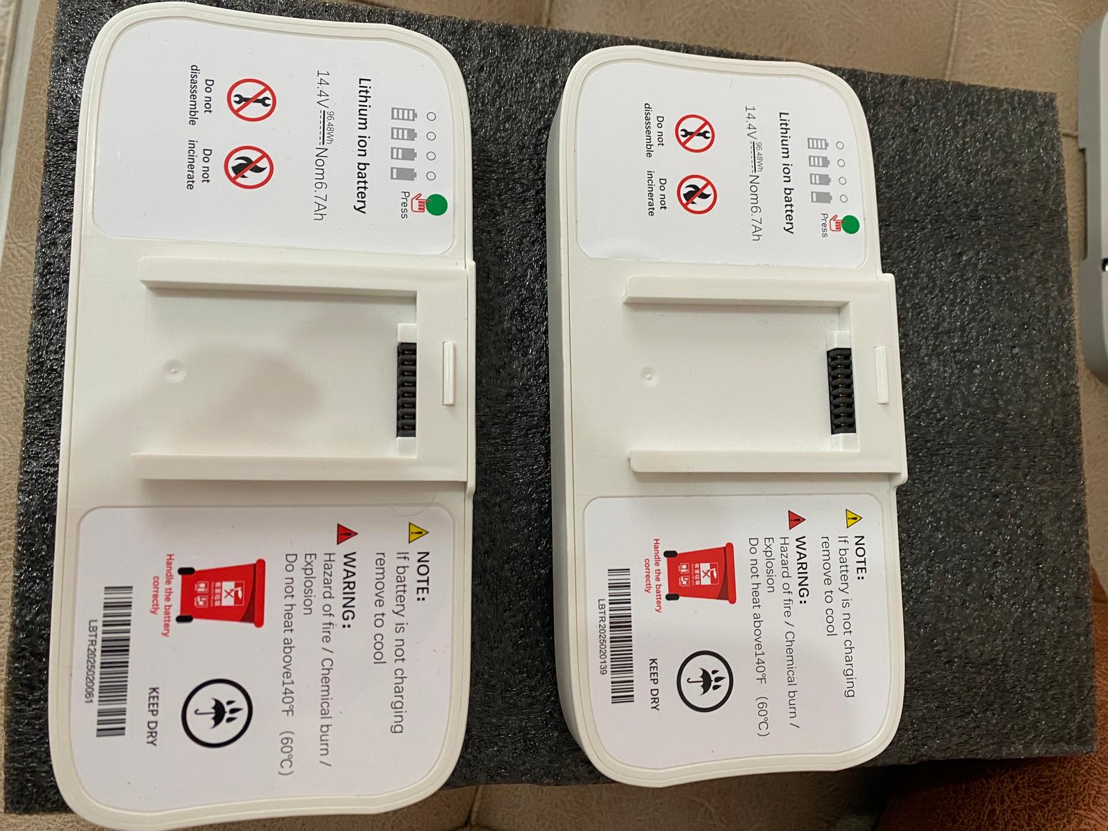 Görsellerde Lityum İyon (Lithium Ion) teknolojisine sahip, cihazın altına takılarak kullanılan harici tipte bataryalar mevcuttur. Bataryaların üzerinde şarj seviyesini gösteren LED göstergeler ve test butonu bulunmaktadır. Batarya etiket bilgileri şu şekildedir: