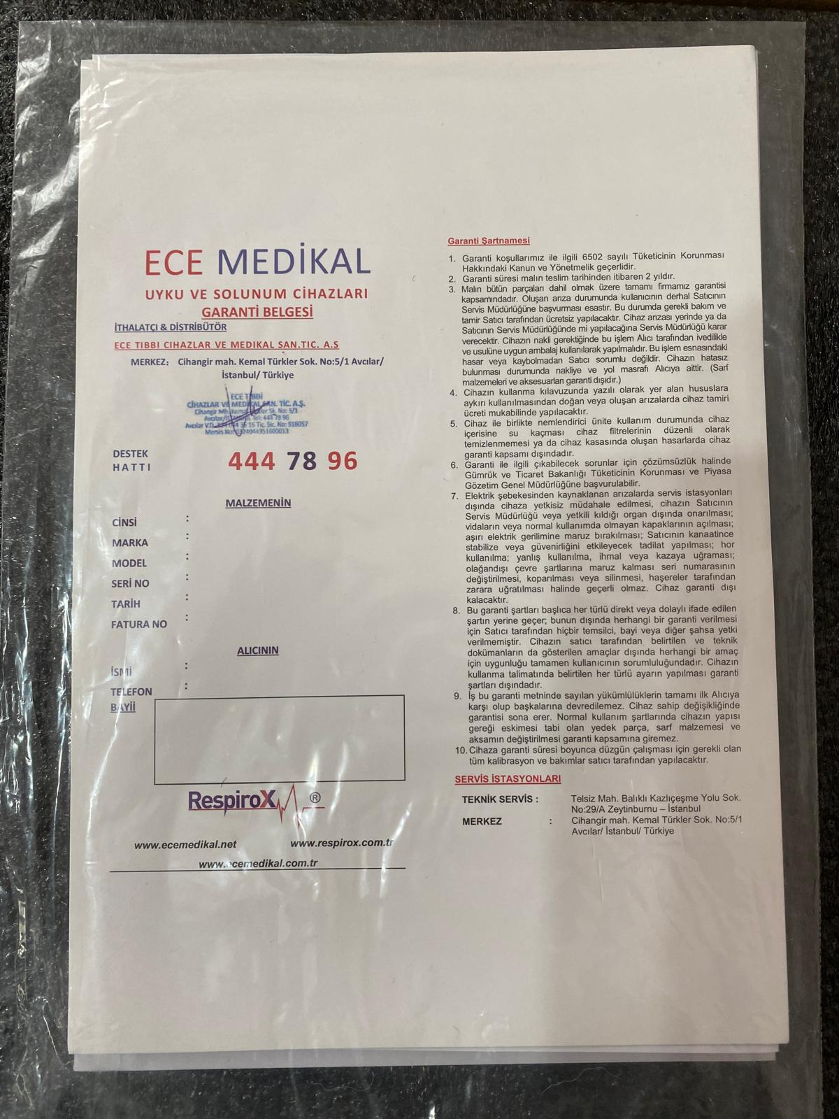 Kutu içeriğinde ECE MEDİKAL başlıklı Garanti Belgesi ve Kullanım Kılavuzu bulunmaktadır. Garanti belgesi üzerindeki; “Satıcı Unvanı”, “Fatura Tarihi” ve “Teslim Tarihi” gibi alanlar boş bırakılmıştır. Bu durum, cihazın garanti sürecinin henüz başlamadığını (satışının henüz gerçekleşmediğini veya kaydının yapılmadığını) gösterir. Ürün, mevzuata uygun Türkçe belgelerle desteklenmiştir.