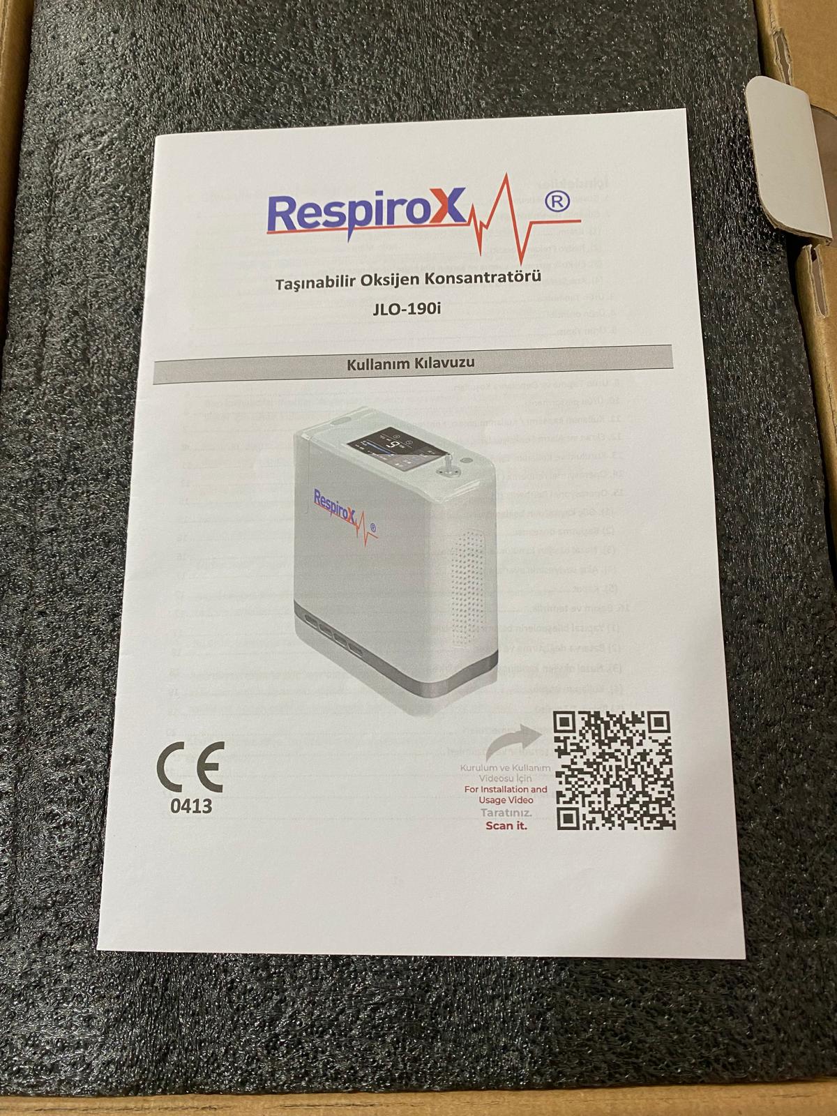 Görsellerde yer alan cihaz, solunum desteği sağlayan medikal bir ekipmandır. Yapılan detaylı görsel inceleme sonucunda cihazın, ortam havasını ayrıştırarak kullanıcıya yüksek yoğunlukta oksijen sağlayan Taşınabilir Oksijen Konsantratörü olduğu tespit edilmiştir. Ürünün markası kutu, cihaz gövdesi ve kullanım kılavuzu üzerinde net bir şekilde RespiroX olarak belirtilmiştir. Model bilgisi ise cihazın arkasındaki etikette ve kullanım kılavuzu kapağında kesin olarak JLO-190i olarak görülmektedir.
