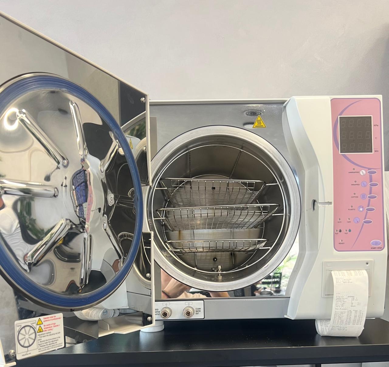 Görsellerde, medikal ve dental aletlerin sterilizasyonu için kullanılan masaüstü bir otoklav cihazı bulunmaktadır. Cihaz, paketli, paketsiz, katı, gözenekli ve içi boş aletleri sterilize etmek üzere tasarlanmıştır. Ön panelinde bir kontrol paneli, dijital ekran, sterilizasyon işlemi bilgilerini yazdıran dahili bir yazıcı ve basınçlı kapak mekanizması yer almaktadır. Paslanmaz çelik iç haznesi ve bu hazne içerisinde aletlerin yerleştirilmesi için iki adet metal raf tepsisi görülmektedir. Toplamda bir adet otoklav cihazı ve iki adet iç raf analiz edilmiştir.