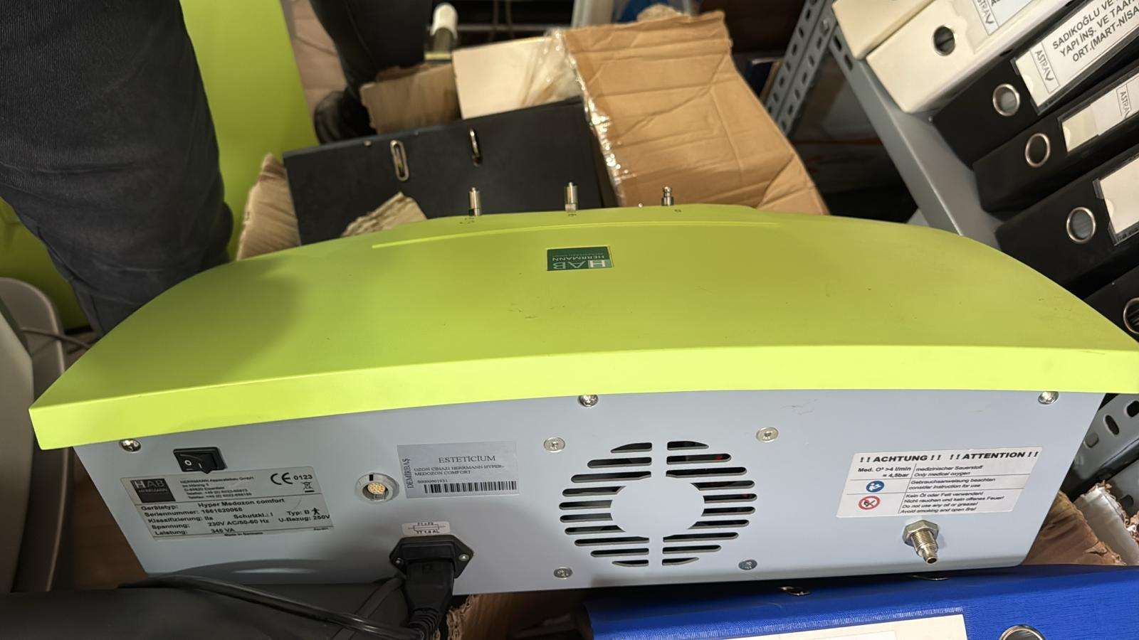 Görseller üzerindeki tüm logolar, arka paneldeki orijinal üretici etiketleri ve ön panel yazıları detaylıca incelenmiştir. Cihazın markası HAB (Herrmann Apparatebau) olarak, modeli ise Hyper Medozon Comfort olarak %100 kesinlikle tespit edilmiştir. Cihaz üzerinde “Hyper Medozon comfort” ibaresi hem ön panelde hem de arka etikette açıkça okunmaktadır.