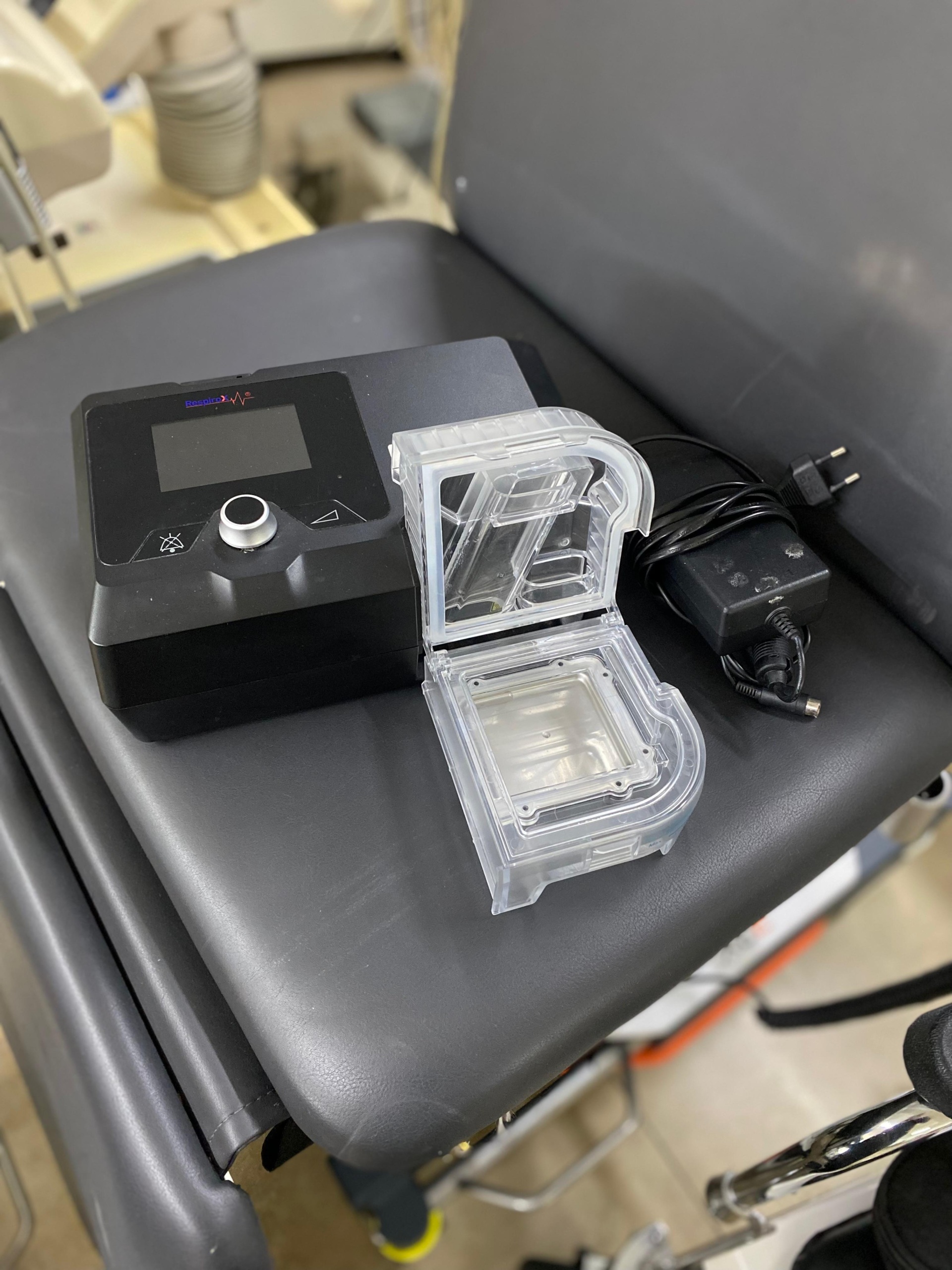 Görsellerde bir adet solunum terapisi cihazı (PAP cihazı), cihazın gövdesine entegre edilebilen bir adet nemlendirici su haznesi ve bir adet harici güç adaptörü bulunmaktadır. Cihaz, masaüstü tipte, siyah renkte plastik gövdeye sahip medikal bir ekipmandır.