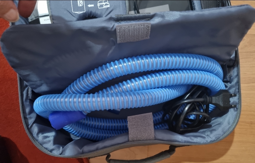 - Hortum: Standart tipte, spiral yapılı mavi renkli bir solunum hortumu (CPAP hortumu) mevcuttur. Hortumun uç kısımlarındaki mavi bağlantı aparatları sağlam görünmektedir. Hortum üzerinde belirgin bir ezilme veya kopukluk yoktur.