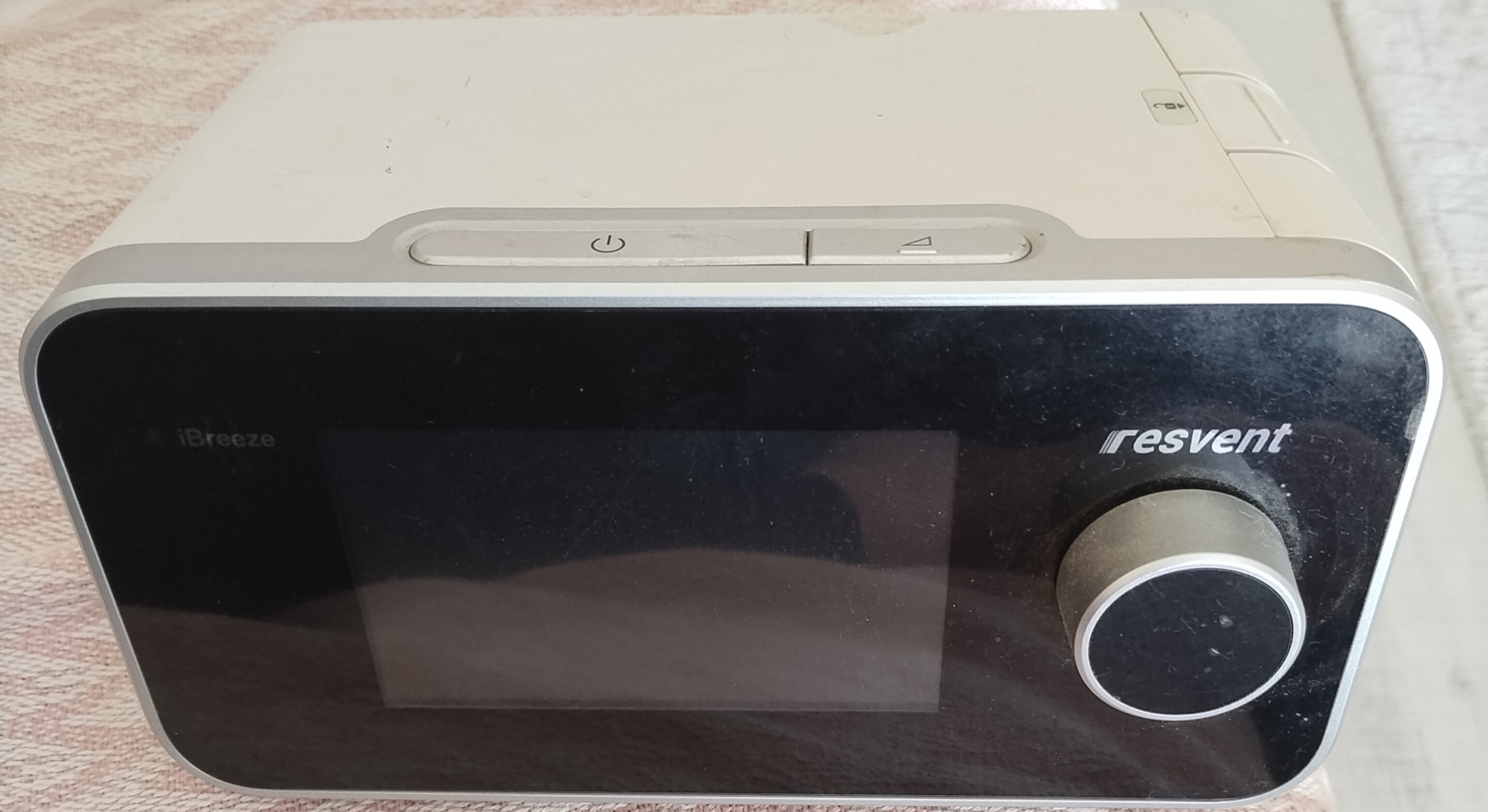 Görsellerde, solunum desteği sağlamak amacıyla kullanılan bir BiPAP cihazı yer almaktadır. Ürünün ön panelinde bulunan resvent logosu ve alt etiketindeki bilgiler, cihazın bir Resvent iBreeze 30ST olduğunu doğrulamaktadır. BiPAP (Bilevel Positive Airway Pressure) cihazları, özellikle uyku apnesi gibi solunum rahatsızlıklarının tedavisinde kullanılan medikal cihazlardır. Cihazın yanında, solunan havayı nemlendirmeye yarayan ve cihaza entegre edilmiş bir su haznesi bulunmaktadır.