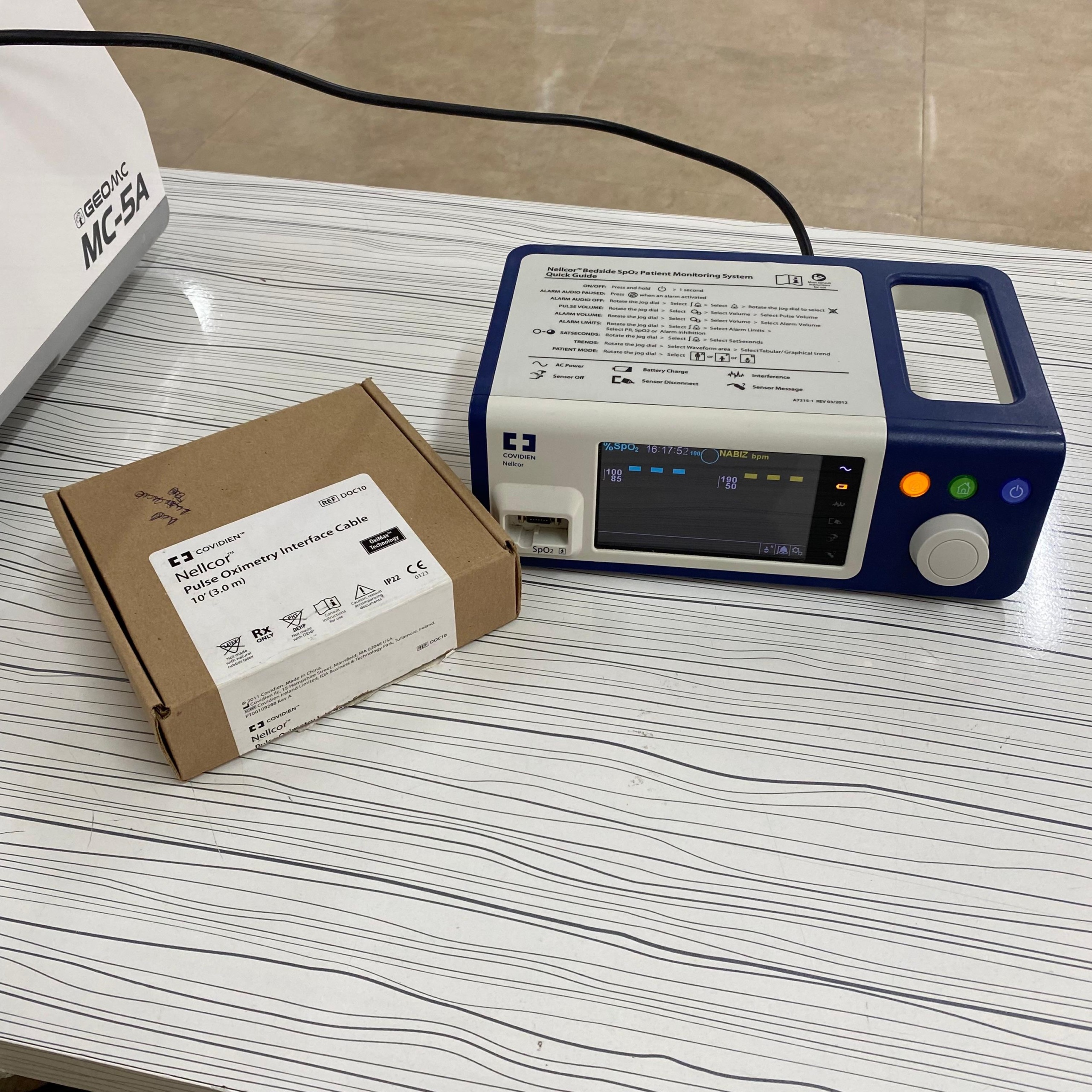 Görsellerde yapılan analiz sonucunda, ana ürünün tıbbi bir izleme cihazı olan yatak başı hasta monitörü (Pulse Oximeter) olduğu tespit edilmiştir. Yanında, bu cihaza ait olduğu anlaşılan kapalı kutu içerisinde bir arayüz kablosu aksesuarı bulunmaktadır.