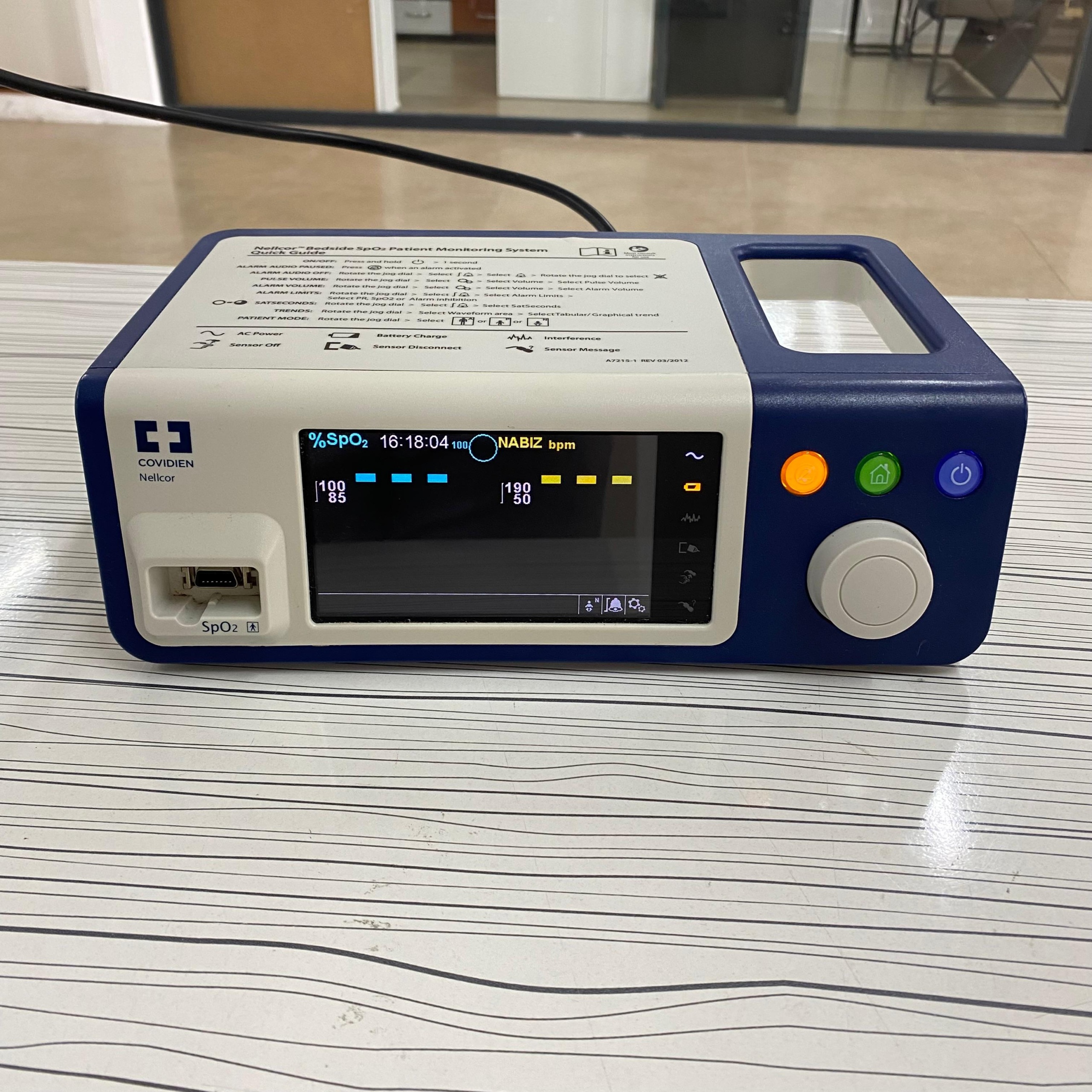 Cihazın ön yüzünde, ekranın sol tarafında ve üst kısımdaki etiket bilgilendirmelerinde COVIDIEN markası ve Nellcor ibaresi net bir şekilde görülmektedir. Cihazın tam model tanımı, üst paneldeki hızlı başlangıç kılavuzu etiketinde Nellcor Bedside SpO2 Patient Monitoring System olarak belirtilmiştir.
