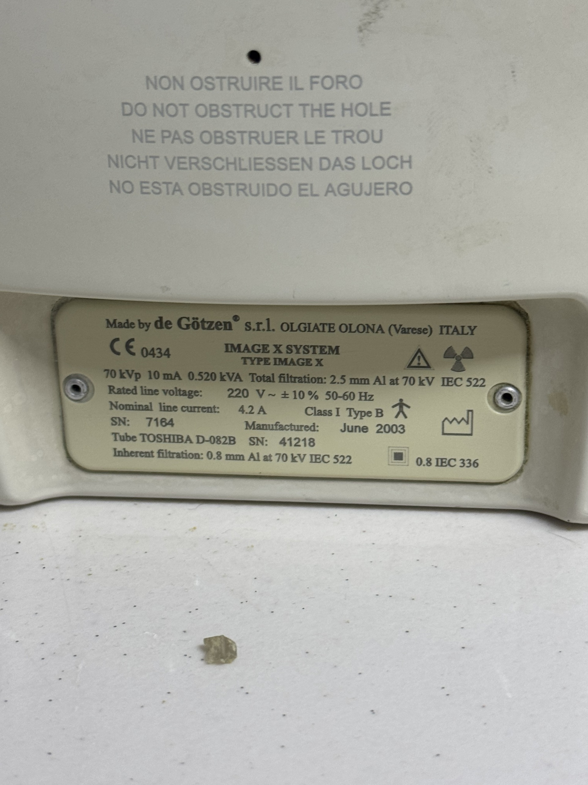 Cihazın üzerinde yer alan etikette üretici firma ve model bilgileri net bir şekilde okunmaktadır. Bu bilgilere göre ürünün markası de Götzen, modeli ise Image X System Type Image X‘tir. Etiketteki “Made in ITALY”, “CE 0434” işareti, seri numaraları ve kullanılan Toshiba marka tüp gibi detaylar, ürünün orijinal bir ekipman olduğu yönünde güçlü kanıtlar sunmaktadır. Üretim yılı etikette Haziran 2003 olarak belirtilmiştir.