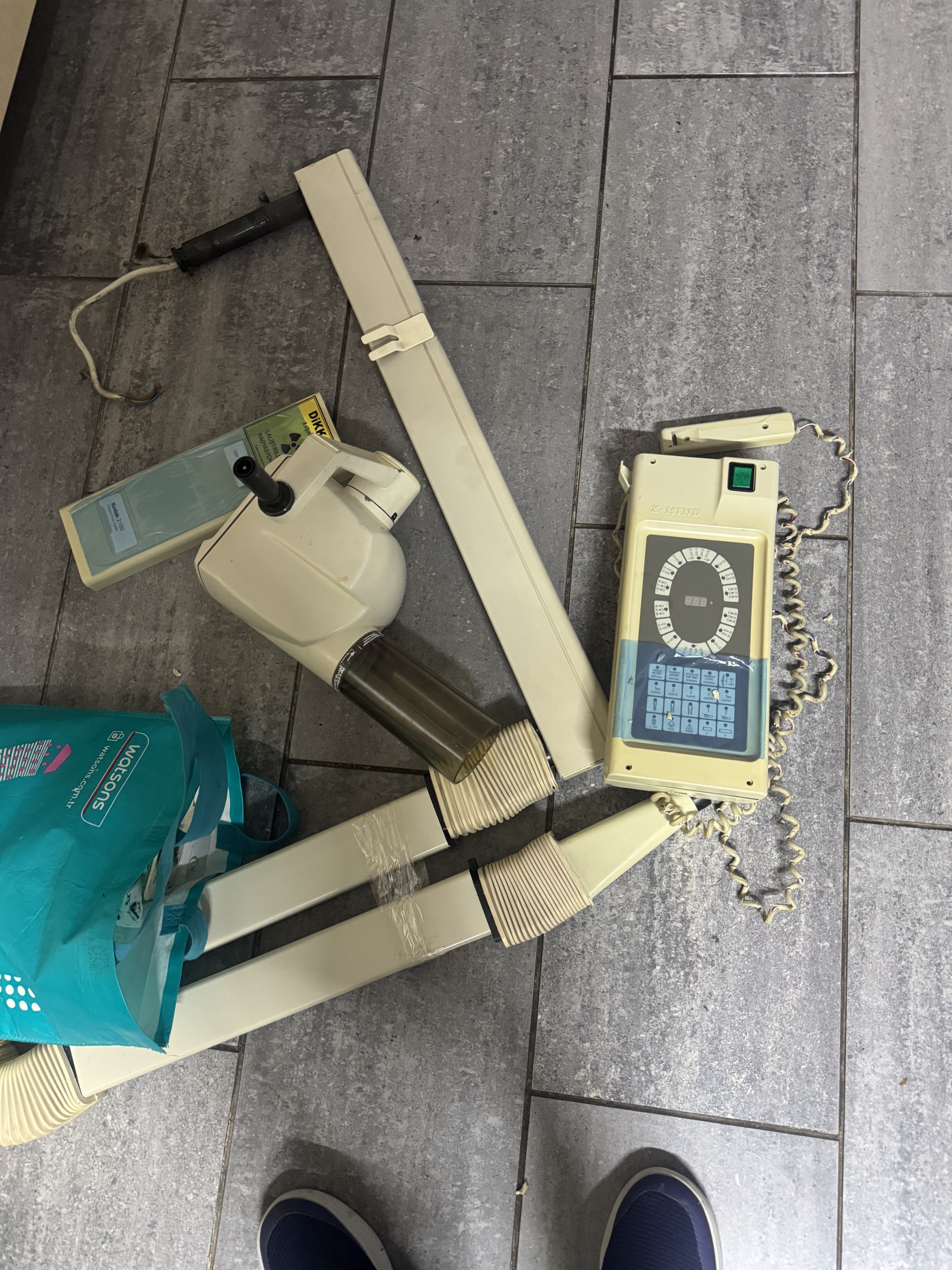 Sunulan görseller, de Götzen Image X model, 2003 üretimi bir dental röntgen cihazının parçalarına aittir. Cihaz demonte haldedir, ciddi fiziksel hasara (kırık kol) sahiptir ve belirgin şekilde eskimiştir. Etiket bilgileri okunabilir durumdadır ve ürünün teknik özelliklerini detaylandırmaktadır. Cihazın mevcut durumu, çalışır hale getirilebilmesi için kapsamlı bir onarım ve profesyonel montaj gerektireceğini açıkça ortaya koymaktadır. Herhangi bir belge veya ek aksesuar görselde bulunmamaktadır.
