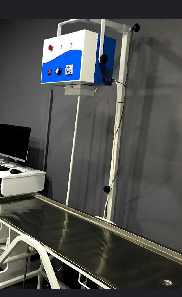 Görselde bir adet röntgen jeneratör başlığı (stative monte), bir adet taşıyıcı statif ünitesi ve bir adet paslanmaz çelik veteriner masası olmak üzere toplamda entegre çalışan bir set görülmektedir.