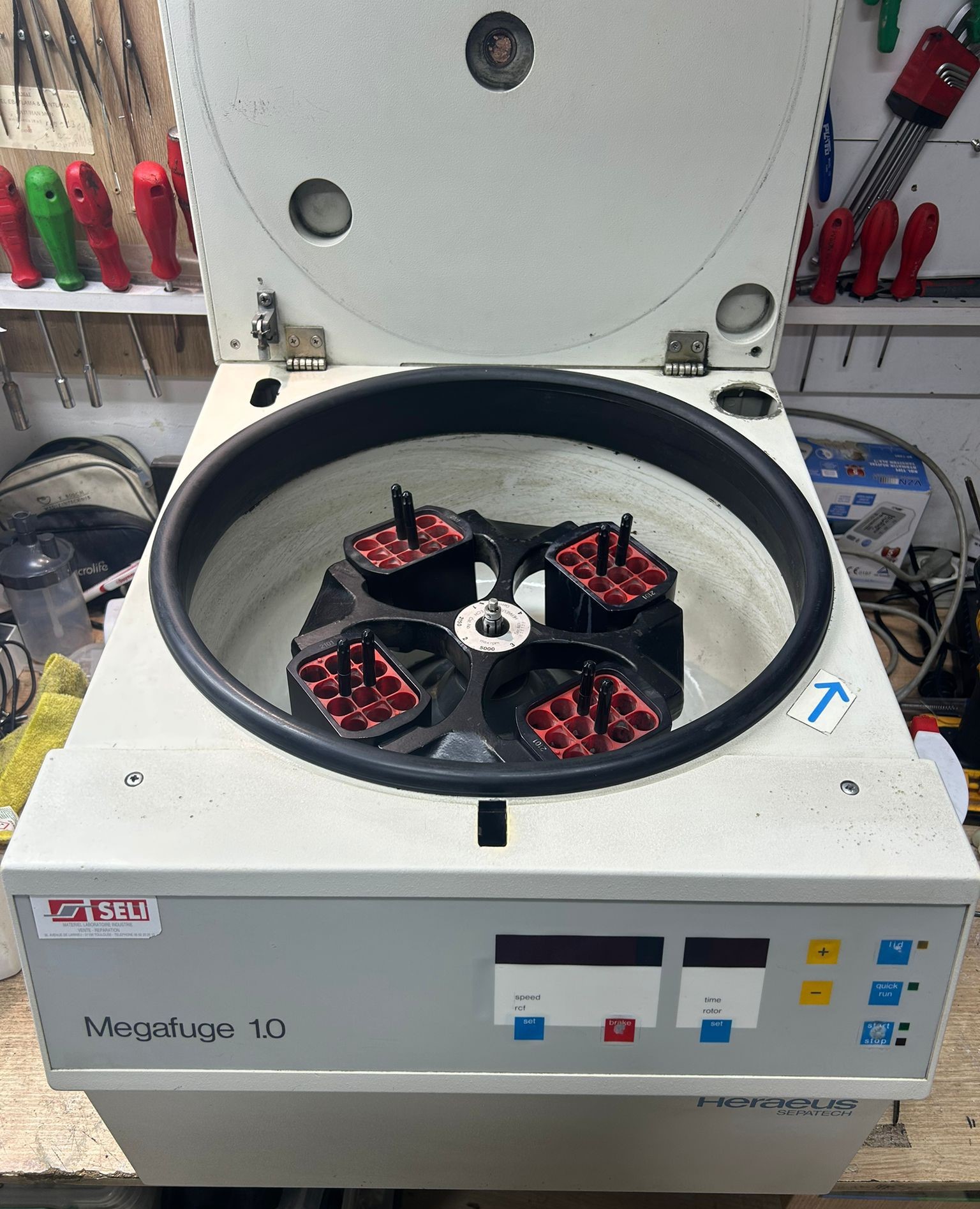 Cihazın ön panelinde yer alan baskılara göre markası Heraeus Sepatech, modeli ise Megafuge 1.0 olarak tespit edilmiştir.