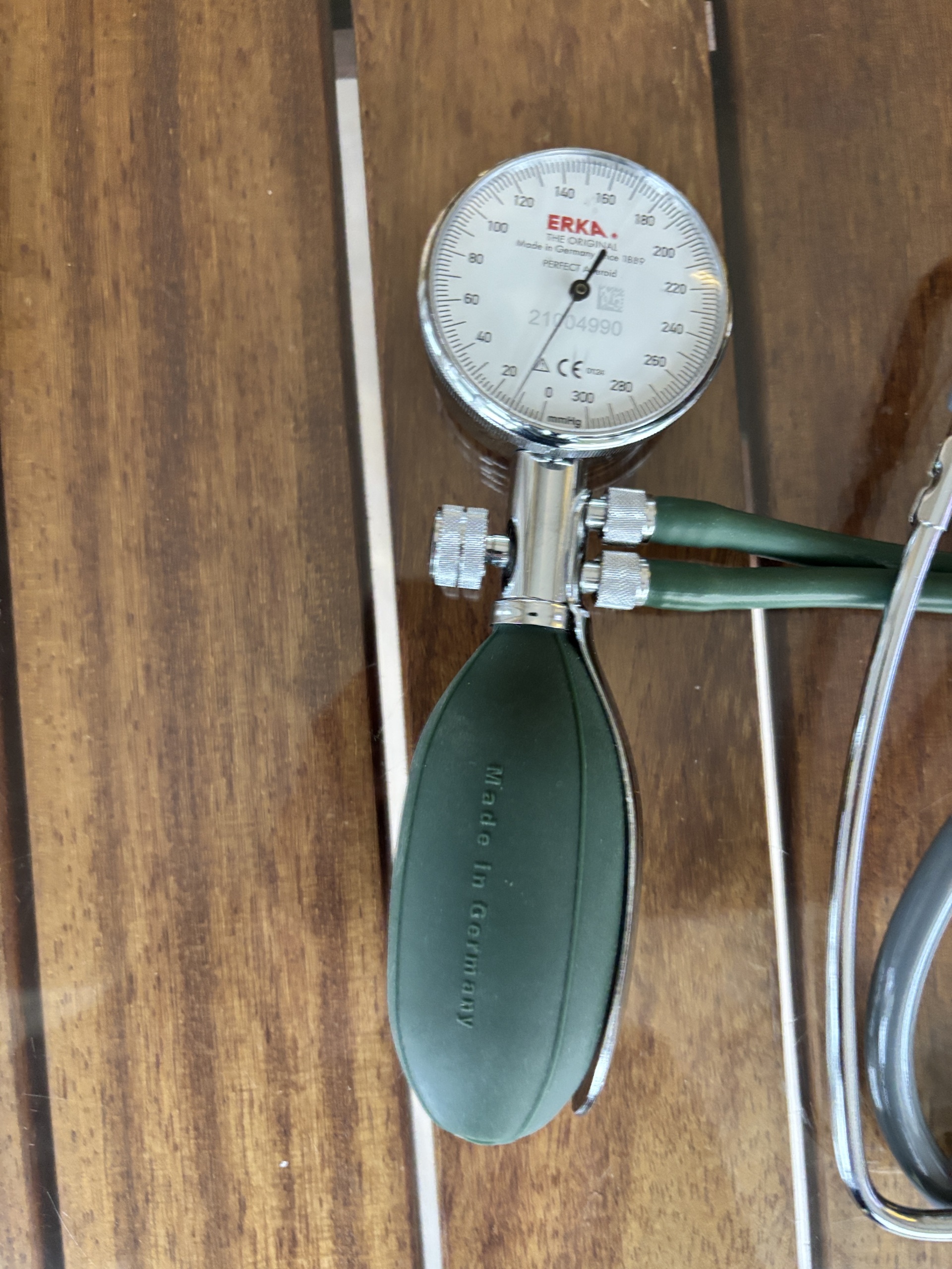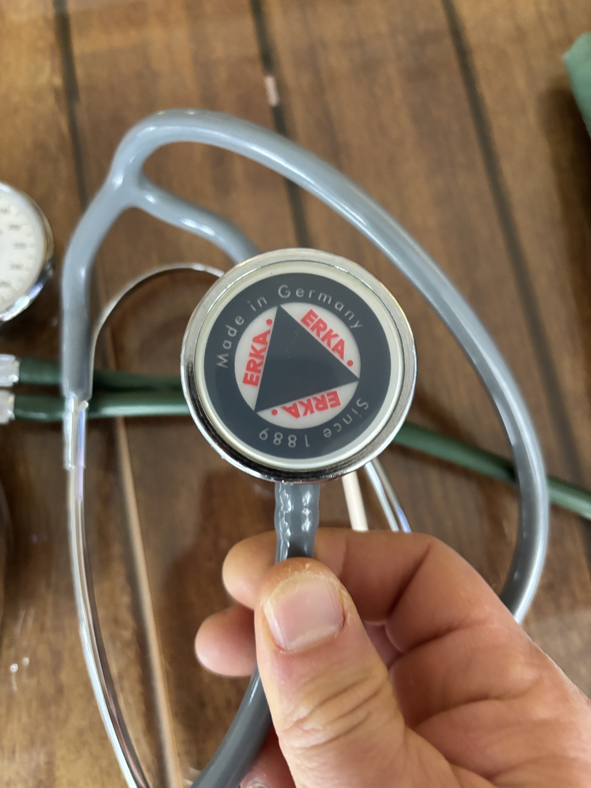 Stetoskop: Sette yer alan stetoskopun, tansiyon aleti ile uyumlu olarak yine ERKA. markasına ait olduğu görülmektedir. Stetoskopun metal gövdesi üzerinde ve diyafram kısmında ERKA logosu ve “Made in Germany” ibaresi açıkça okunmaktadır. Ancak stetoskopun özel model ismi (Finesse, Sensitive vb.) görsellerde metin olarak kesin bir şekilde ayırt edilemediği için sadece marka tespiti yapılabilmiştir.