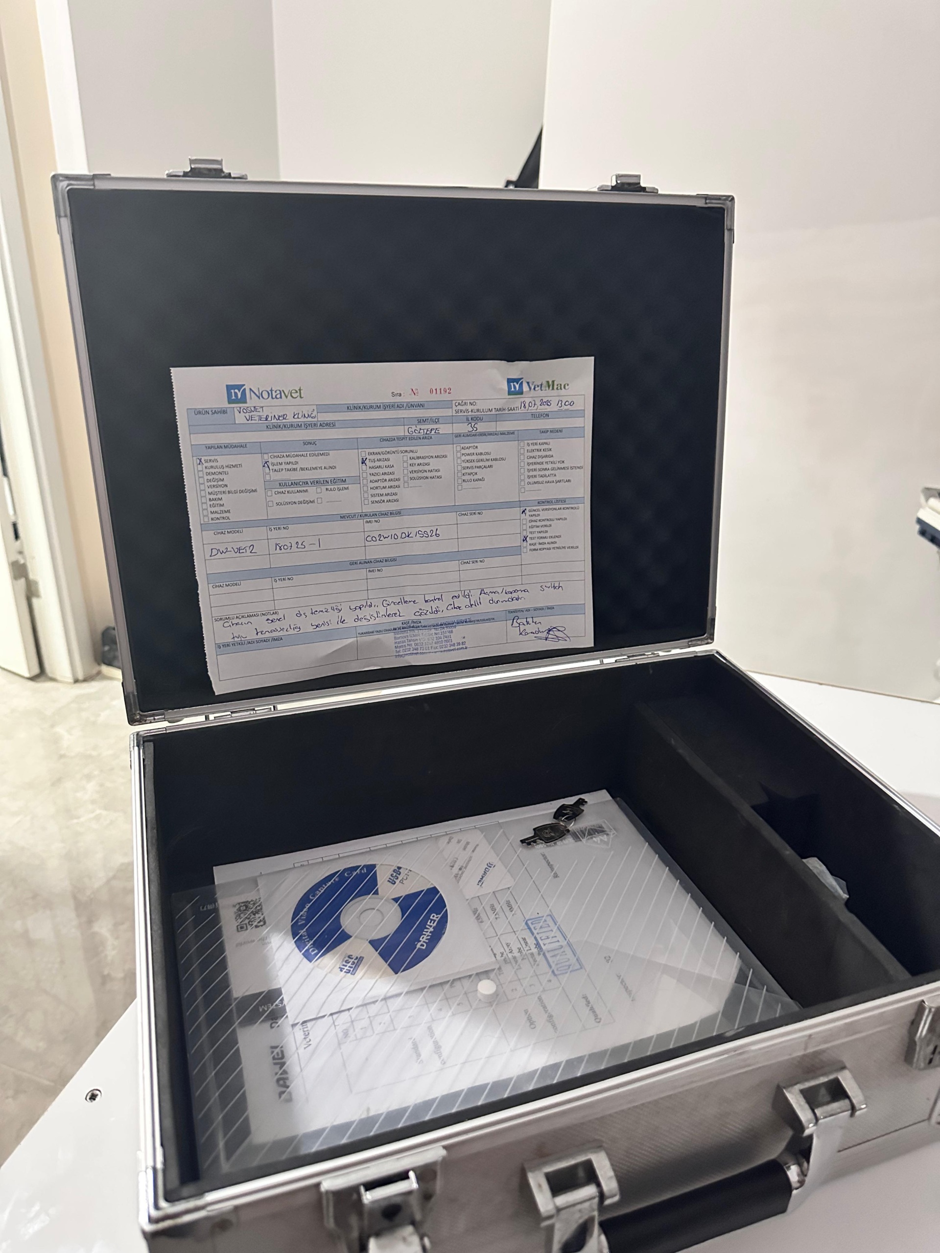 Cihazın taşıma çantasının kapağına yapıştırılmış bir teknik servis formu (Notavet / VetMac) bulunmaktadır. Bu formda yer alan bilgiler şunlardır: