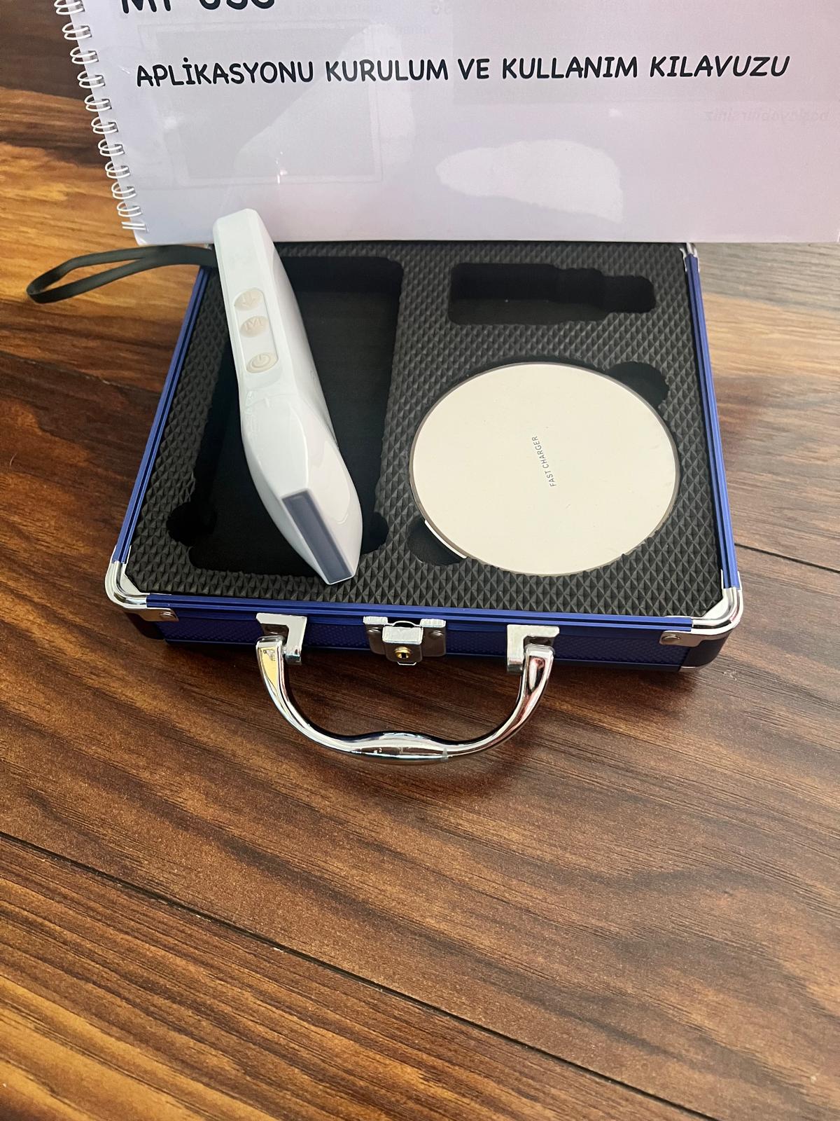 Görsellerde incelenen ürün, kablosuz (wireless) teknoloji ile çalışan, portatif bir tıbbi ultrason görüntüleme probudur. Cihaz, görüntüleri mobil cihazlara veya tabletlere aktarmak üzere tasarlanmış modern bir medikal ekipmandır. Ürünle birlikte şarj ünitesi, taşıma çantası ve kullanım kılavuzu set halinde görüntülenmektedir.