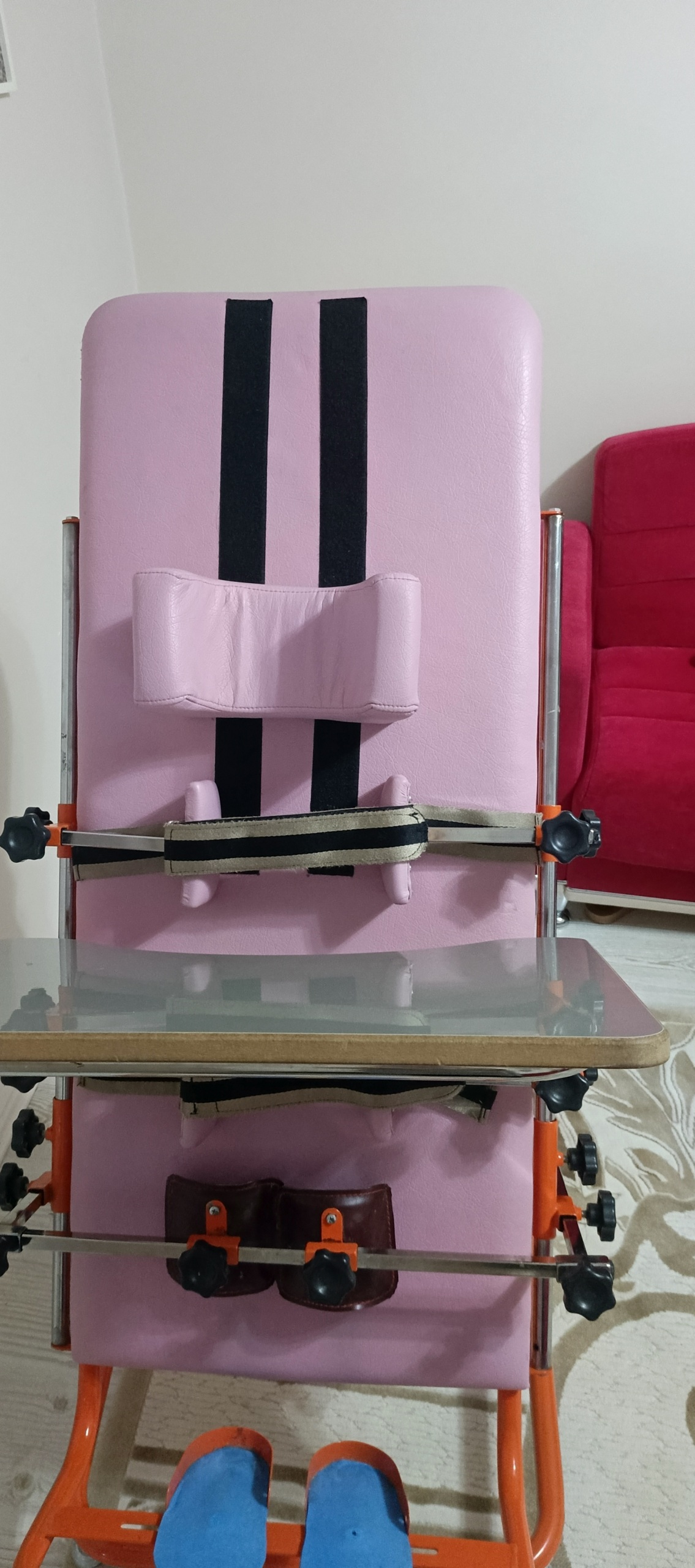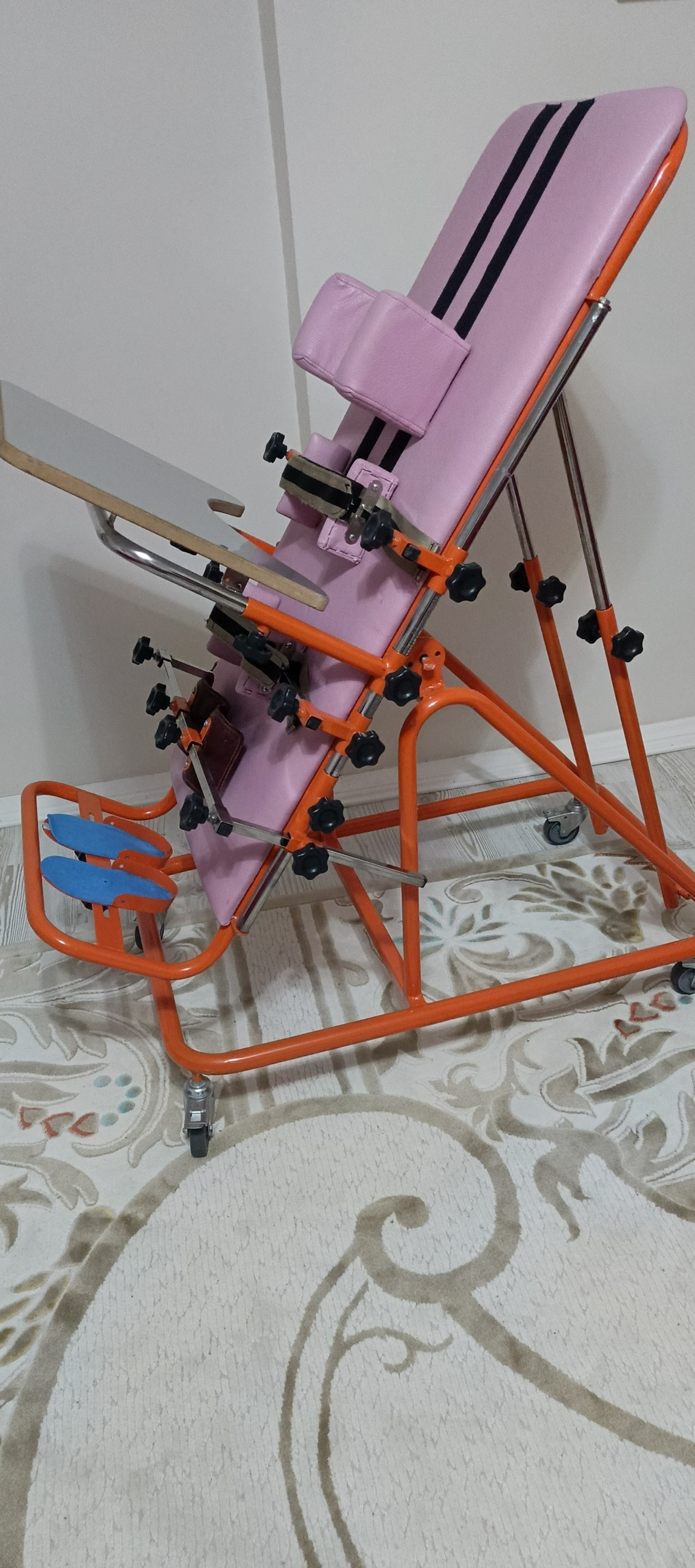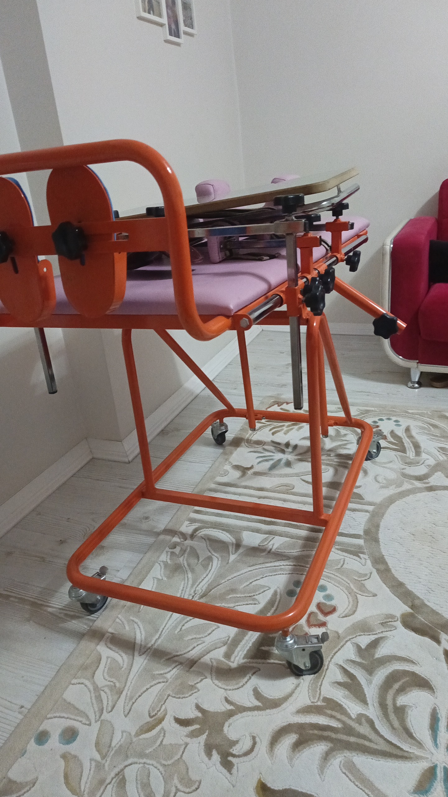 Görsellerdeki ürün, fizik tedavi ve rehabilitasyon süreçlerinde kullanılan mekanik bir pediatrik ayakta dik durma cihazıdır. Hastanın yatay pozisyondan dikey veya açılı pozisyona getirilmesini ve bu pozisyonda güvenle desteklenmesini sağlar. Pediatrik nöroloji, ortopedi ve fizik tedavi alanlarında kullanıma uygundur. Görsellerde cihazın markasını, modelini, üretim yılını veya seri numarasını belirten herhangi bir etiket, logo veya yazı bulunmamaktadır.