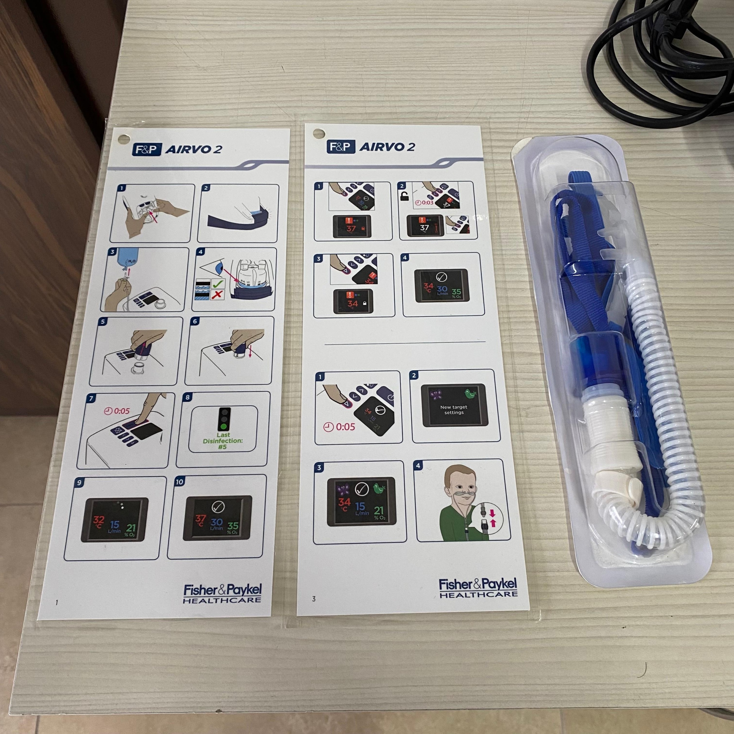 Görsellerdeki ürün, profesyonel solunum tedavisi için kullanılan Fisher & Paykel marka AIRVO 2 model bir cihazdır. Cihaz ikinci el durumundadır ancak fiziksel olarak iyi kondisyondadır. Yanında orijinal çantası, kullanım kılavuzları ve 2027 yılına kadar kullanım ömrü olan, açılmamış ambalajda 1 adet uyumlu (Excellentcare marka) küçük boy nazal kanül bulunmaktadır. Kullanım için gerekli olan su haznesi şu an cihazın üzerinde değildir.